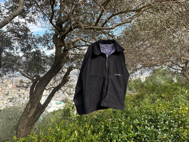 Constructed from cotton pinstripe, this jacket is fully lined and meticulously tailored. Significant attention was given to the back, inspired by a design featuring a split revealing a colorful interior. I translated this concept using matching gingham on both the front pocket and the back, creating a playful yet cohesive detail.